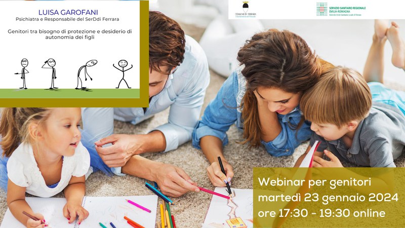 "Genitori alle prese con la protezione dei propri figli e la loro autonomia" che si terrà martedì 23 Gennaio 2024 dalle 17.30 alle 19.30, condotto dalla Dr.ssa Luisa Garofani Psichiatra SerD dell'AUSL di Ferrara.