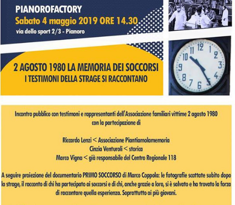 A seguire proiezione del documentario PRIMO SOCCORSO di Marco Coppola: le fotografie scattate subito dopo la strage, il racconto di chi ha partecipato ai soccorsi e di chi, anche grazie a loro, si è salvato e ha trovato la forza di raccontare quella esperienza. Soprattutto ai più giovani.