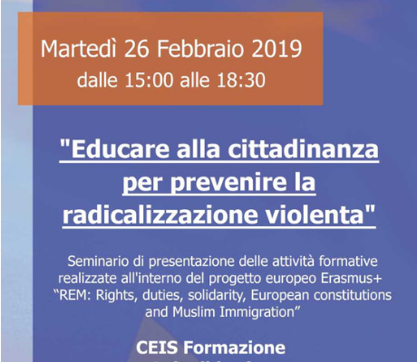 L'evento, organizzato all'interno delle attività del progetto europeo REM (del quale Ceis Formazione è capofila) sarà un momento di confronto e approfondimento sul tema dell'educazione alla cittadinanza a scuola e nella società, come forma di prevenzione primaria della radicalizzazione violenta nei giovani, nonché occasione per far conoscere le metodologie e gli strumenti didattici sviluppati all’interno del progetto e i risultati dei percorsi formativi pilota, sperimentati nel corso dell'anno 2018 a Modena con alcuni giovani ospiti delle nostre comunità per minori stranieri non accompagnati e giovani richiedenti asilo (Martignana, La Corte, San Pancrazio, La Coccinella, Argonauta).
