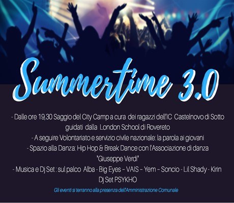 Summertime 3.0 che spettacolo! serata a Castelnovo sotto, presso la Arena Estiva Parco Rocca, a partire dalle 19.30 con saggio del City camp a cura dei ragazzi dell'Ic di Castelnovo sotto, a seguire volontariaiato e servizio civile nazionale: la parola ai ragazzi e poi spazio alla danza con hip hop e break dance, musaica e DJ set: sul palco Alba, Big Eyes, VAIS, Yem, Soncio, Lil Shady, Kirin, dj set Pshyco.
