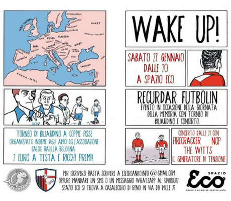L’Amministrazione comunale di Casalecchio di Reno, in occasione della celebrazione del Giorno della Memoria (27 gennaio), organizza una serie di iniziative coordinate dal Servizio Casalecchio delle Culture. Sabato 27 gennaio, a partire dalle ore 20.00, nel Palco sul Reno di Spazio Eco (Via dei Mille, 26 – Casalecchio di Reno), si terrà una serata di memoria molto particolare proposta da Associazione Esecreando e Bologna Calcio Balilla: "Wake Up! Recurdar Futbolin" intende ricordare le poco note origini del biliardino, inventato in Catalogna come "futbolin", con i suoi giocatori rossi e blu, dal militante antifranchista Alejandro Finisterre, nel bel mezzo della guerra civile spagnola che precorreva gli orrori della Seconda Guerra Mondiale.