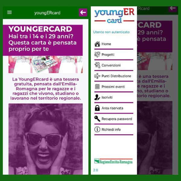 - App YoungERcard: un’app semplice e chiara in cui giovani e studentə potranno scoprire a portata di mano progetti, convenzioni ed eventi interessanti. Non è sempre facile restare al passo con tutto quello che accade nella nostra regione, ma quest’app vuole dare l’opportunità di trovare l’attività che più è nelle tue corde e fare così più esperienze possibili utili a livello personale ma anche professionale.
