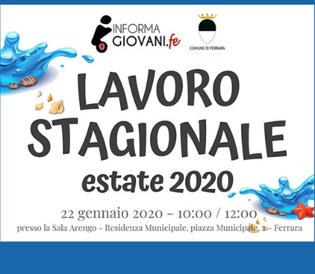 E' rivolto a coloro che cercano un lavoro per la prossima stagione estiva l'incontro organizzato dall'Agenzia Informagiovani di Ferrara in collaborazione con Informagiovani di Comacchio-Portogaribaldi che si svolgerà mercoledì 22 gennaio a partire dalle ore 10.00 presso la Sala dell'Arengo (piazza Municipale, 2- Ferrara).