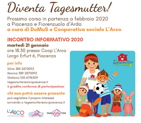 A Piacenza la Cooperativa L'Arco - uno degli enti gestori locali del servizio, attivo da anni anche nella formazione di nuove Tagesmutter - ha scelto di investire ulteriormente in questo servizio, ottenendo l’accreditamento all’Associazione Nazionale DoMuS, nata nel 2007 dalla volontà di sostenere e promuovere anche in Italia l’esperienza delle Tagesmutter.