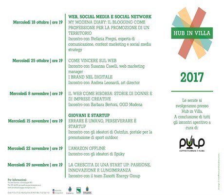 A Formigine, presso Hub in Villa (Via Sant'Antonio, 4) si svolgerà una serie di incontri a partire dal mese di ottobre; si tratta di 6 serate dedicate a tematiche quali web, social media, socialnetwork, giovani e start up.