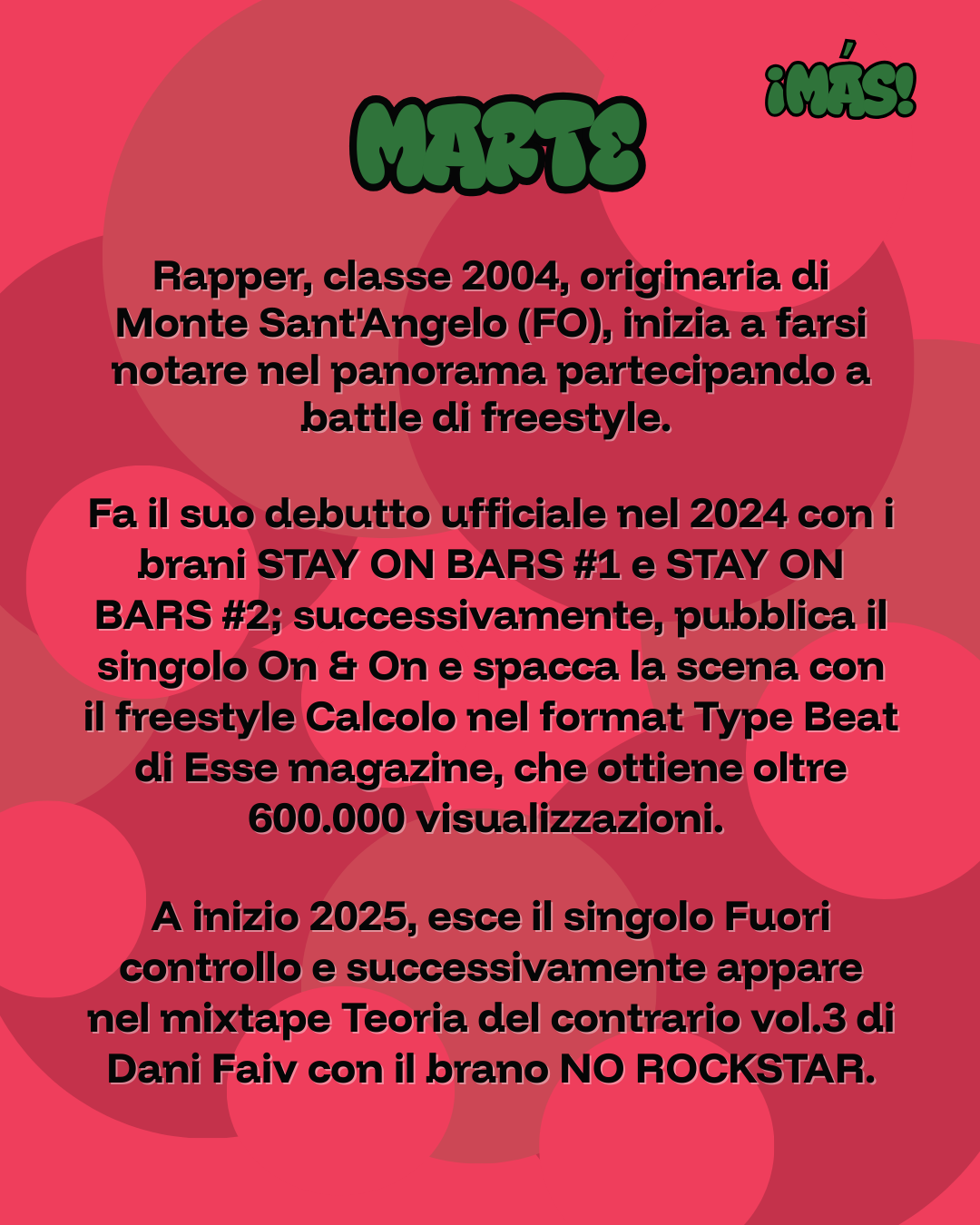 - Ore 21:30 – Ospiti principali: Rea, finalista di Sanremo Giovani 2024; Cuta, rapper milanese vincitore di Nuova Scena (Netflix); Marte, giovane voce del rap pugliese