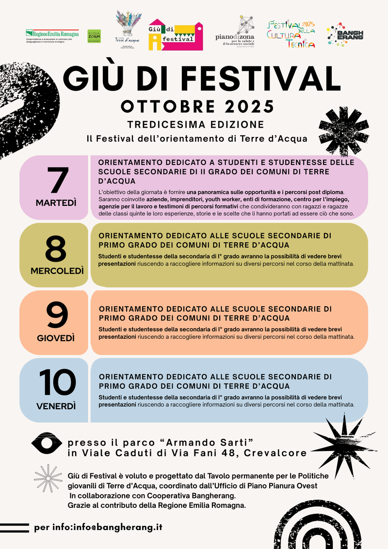 Gli studenti delle scuole superiori e degli enti di formazione del territorio raccontano ai colleghi più giovani i propri indirizzi di studio, descrivendo la propria esperienza, supportandoli nella scelta della scuola superiore e fornendo elementi concreti per le considerazioni da fare in merito. Studenti e studentesse della secondaria di I° grado avranno la possibilità di vedere brevi presentazioni riuscendo a raccogliere informazioni su diversi percorsi nel corso della mattinata. Giù di Festival è voluto e progettato dal Tavolo permanente per le Politiche giovanili di Terre d’Acqua, coordinato dall’Ufficio di Piano Pianura Ovest in collaborazione con Cooperativa Bangherang, grazie al contributo della Regione Emilia Romagna.