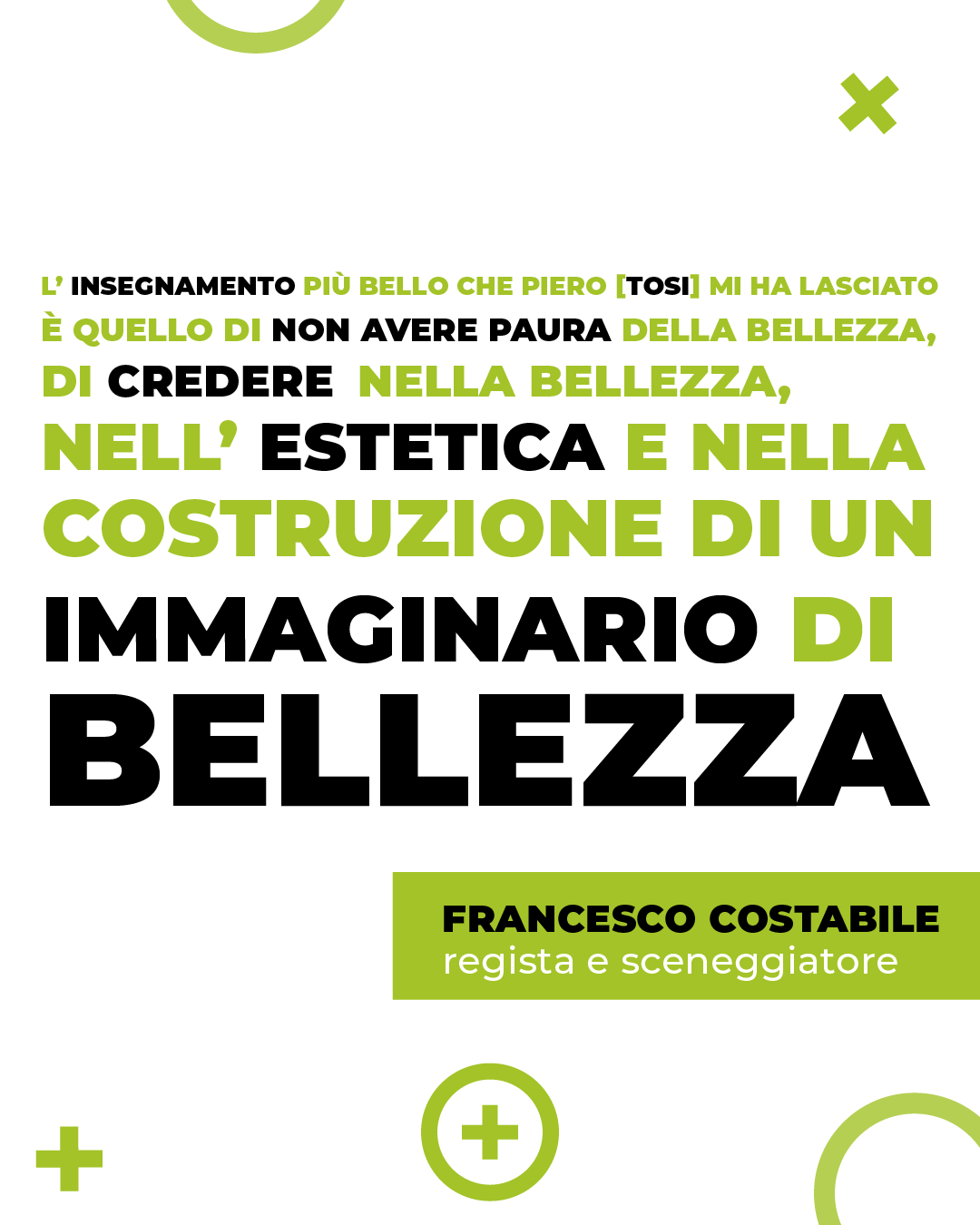 Io dico sempre che l’unico maestro che ho avuto in vita è stato Piero Tosi, il grande costumista di Luchino Visconti (e non solo), su cui io ho anche fatto un paio di documentari. Piero è stato mio insegnante del corso di costume al Centro Sperimentale, e con lui è nata un’amicizia profonda che mi ha riempito il cuore e mi ha fatto capire anche tante cose in merito alla composizione e all’immagine. L’insegnamento più bello che Piero mi ha lasciato è quello di non avere paura della bellezza, di credere nella bellezza, nell’estetica e nella costruzione di un immaginario di bellezza. Spesso si ha paura di creare un’estetica della bellezza perché si ha il terrore di cadere nell’estetismo, che è effettivamente un rischio, però purtroppo la contropartita di questa paura è l’appiattimento, il naturalismo sciapo, che poi rischia di essere televisivo, omologante e convenzionale.