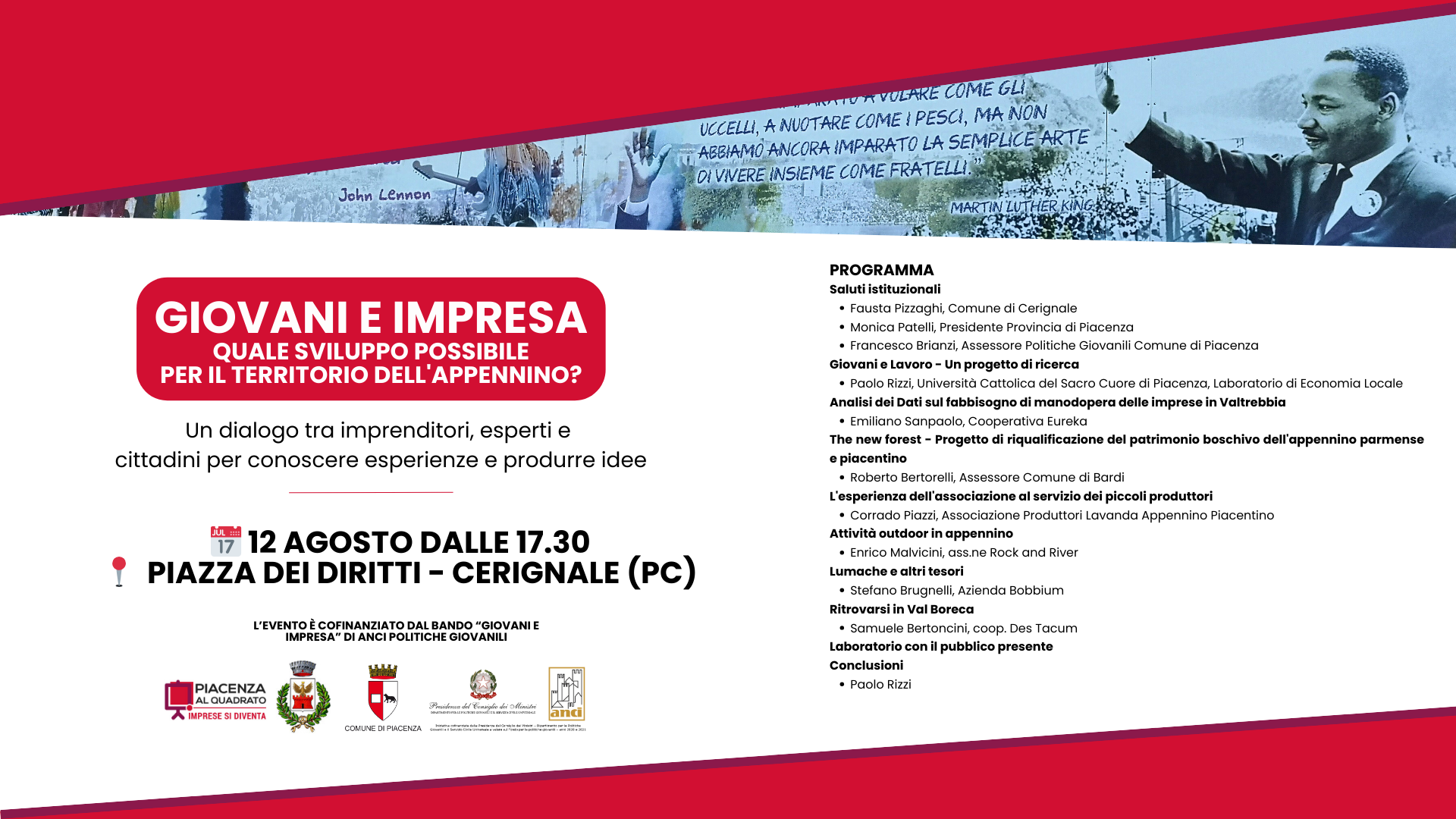 Organizzato a Cerignale il prossimo 12 agosto, lunedì dalle 17.30, dai partner Sol.Co, Eureka, L'Arco e Brainfarm, dal titolo: GIOVANI E IMPRESA. QUALE SVILUPPO POSSIBILE PER IL TERRITORIO DELL'APPENNINO?