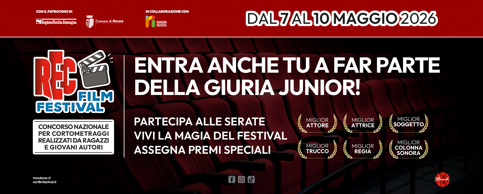 Nuova edizione del REC Film Festival, concorso nazionale per cortometraggi realizzati da ragazzi e giovani autori, in programma presso il Teatro Tarkovskij di Rimini da giovedì 7 a domenica 10 maggio 2026 con il patrocinio di Regione Emilia-Romagna e Comune di Rimini.